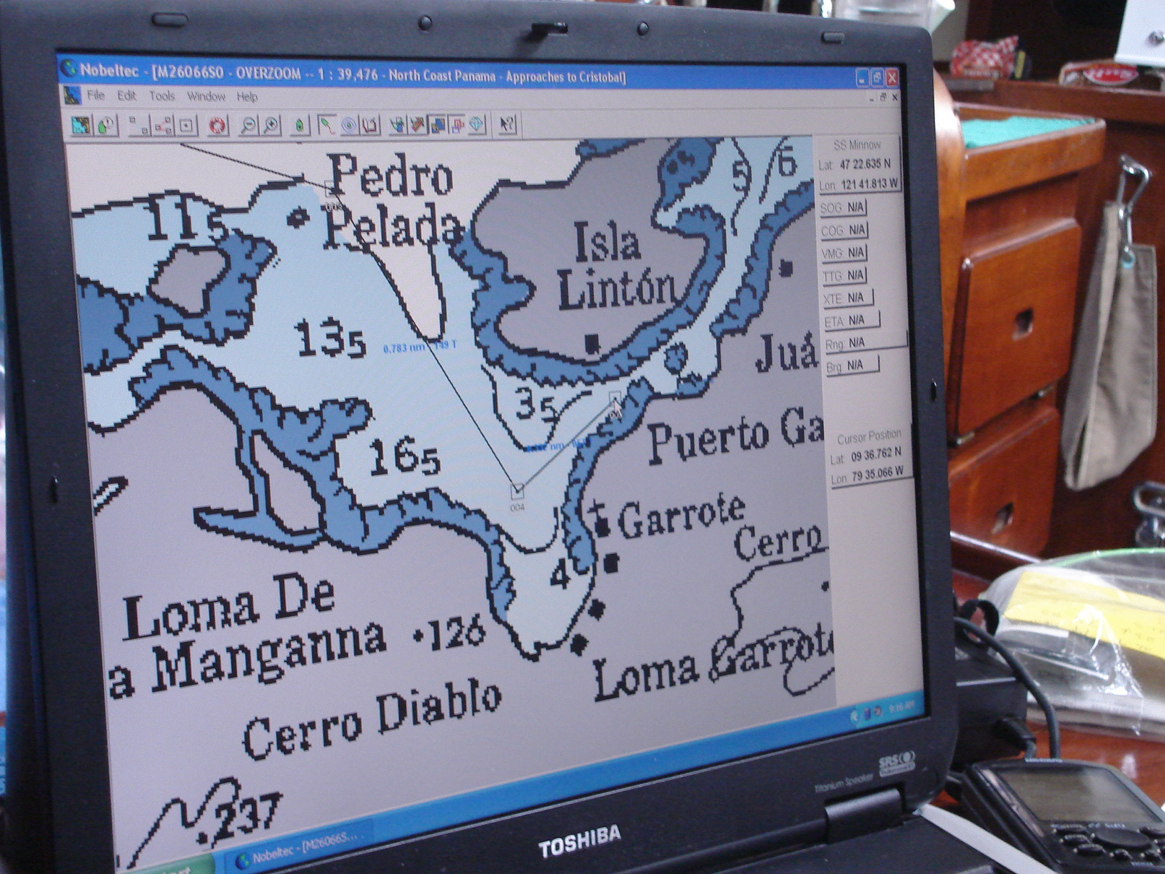 Normalmente, se tiene dos controles, se plantea y se establece un punto de partida y de llegada, se establecen varios puntos intermedios de control, para saber si llevamos el rumbo correcto. Y se supervisa con un control de carta de navegación, es un control manual por si falla el electrónico. Hoy esto no se usa, yo no lo veo bien, porque un golpe, un rayo, etc, mas de una ves quemo todo lo electrónico en el Barco.